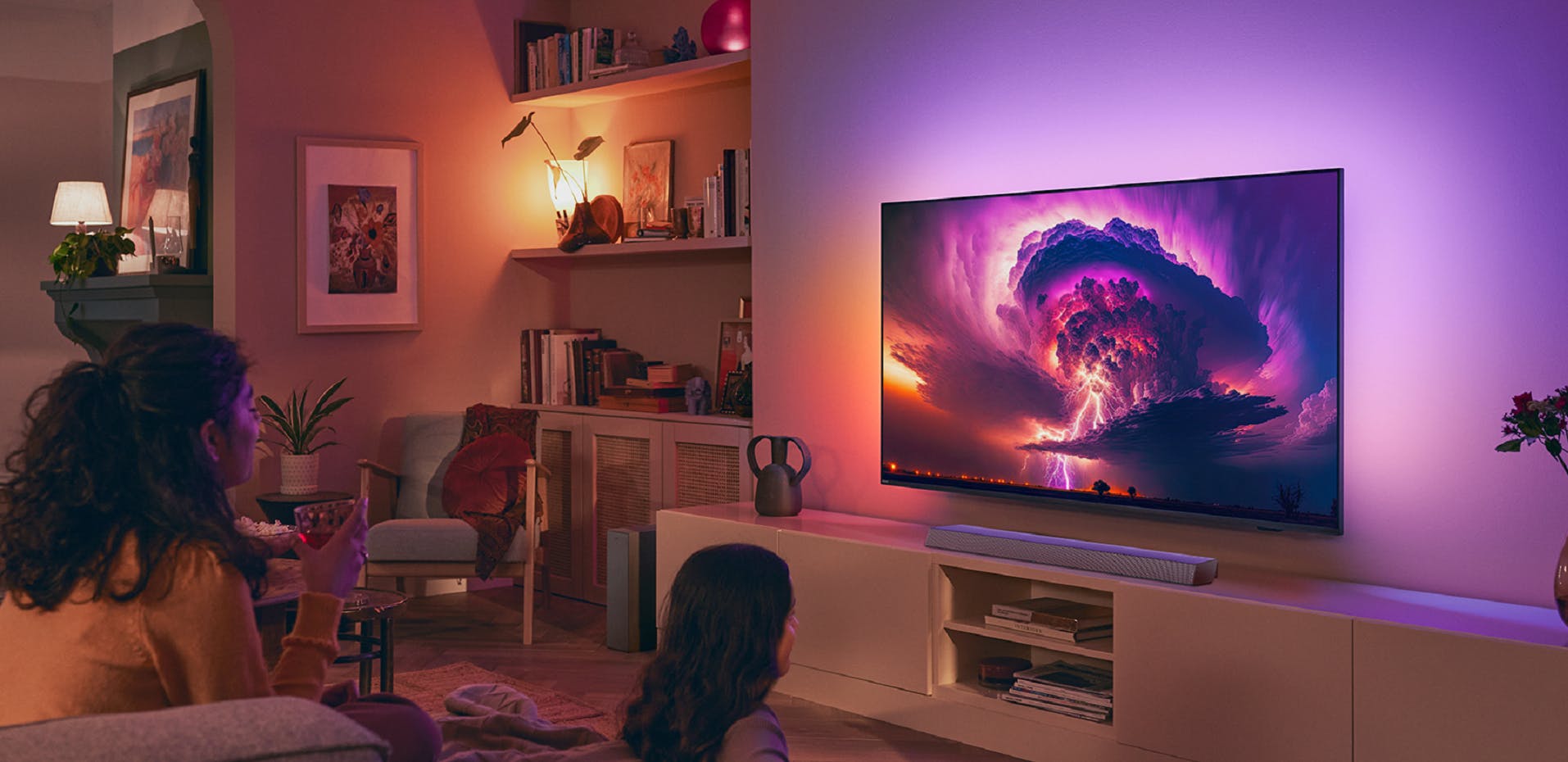 Exclusief op iedere Philips-tv is natuurlijk Ambilight. De 55PUS8808 kreeg een driezijdige versie; weliswaar niet de nauwkeurigere Next Generation versie, maar de klassieke versie. Dat hoeft niet per se een gemis te betekenen. Ambilight smeert de kleuren van wat je kijkt breed uit over de achterliggende wand, en heeft tal van instellingen om de ambiance aan te passen naar jouw smaak. Ambilight kan zowel reageren op beeld als geluid. Met Ambilight Aurora gebruik je het samen met een mooie screensaver. Dankzij AmbiWakeup en AmbiSleep kan de tv in de slaapkamer zelfs dienen als wekker.