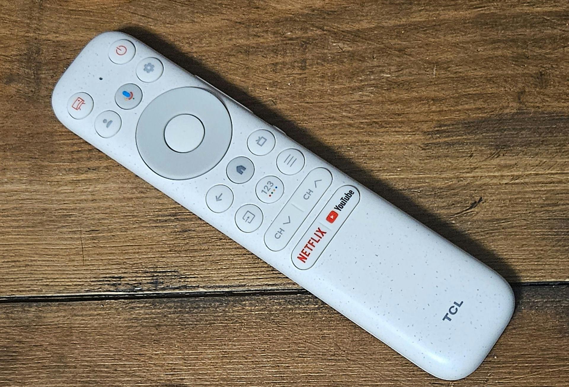 De afstandsbediening is uitgevoerd in wit, passend bij de tv. Ze gebruikt een eenvoudigere lay-out zonder numerieke toetsen die we ook al op de C855 aantroffen. De afgeronde vorm ligt goed in de hand, en de toetsen hebben een goede, duidelijke aanslag. Opvallend is wel dat de volumetoets lijkt te ontbreken. Die is aan de zijkant van de afstandsbediening geplaatst, zoals bij een smartphone. Helaas vinden we dat erg onhandig; gelukkig kun je ook de d-pad links- en rechts-toetsen gebruiken om het volume aan te passen.