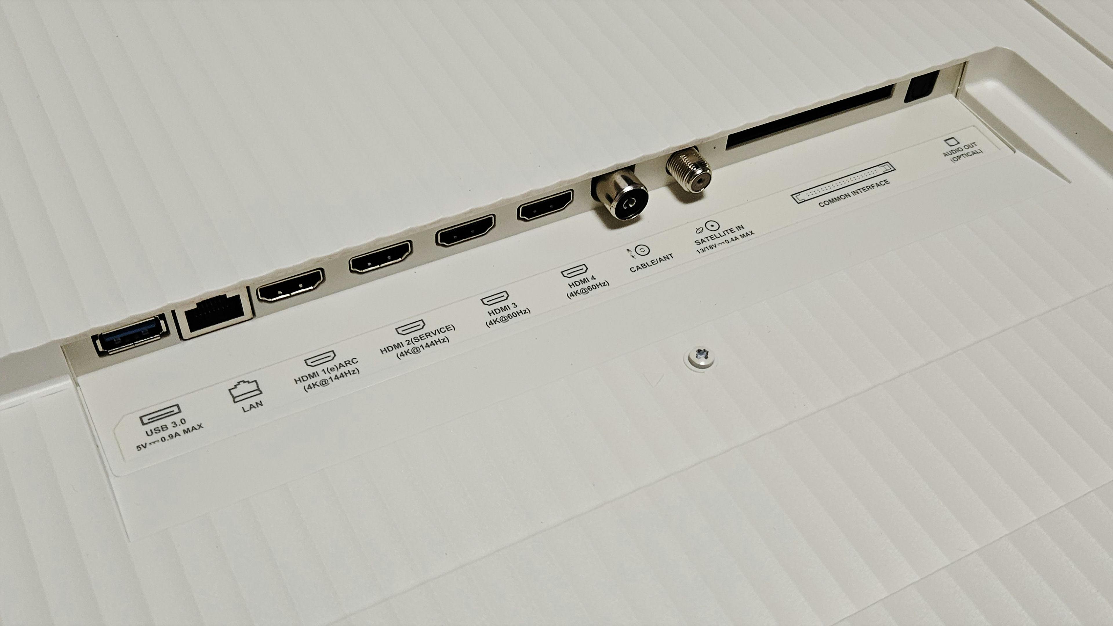 Deze TCL is in de eerste plaats gericht op wandmontage. Het is geen verrassing dat alle aansluitingen naar beneden gericht zijn, en er zijn zelfs een reeks gootjes voorzien aan de achterkant zodat je de kabels netjes kunt wegwerken. Het toestel beschikt over vier HDMI-aansluitingen, waarvan twee geschikt zijn voor high-end gaming. Op poort 1 en 2 kun je dankzij de 48Gbps bandbreedte gamen in 4K met maximaal 144 beelden per seconde.