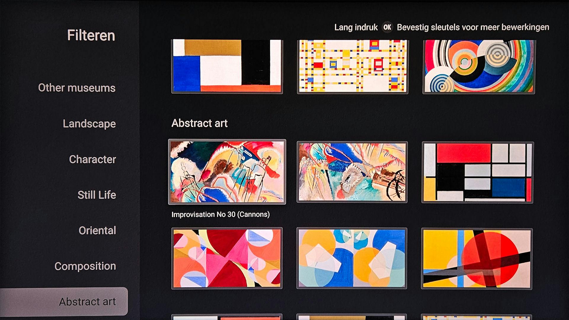 De NXTFRAME-app gebruik je om allerlei kunstwerken op het scherm te tonen. TCL levert daarin een aanbod van 378 kunstwerken, zowel klassiek, digitaal als fotografisch. Monet en Van Gogh zijn wel wat oververtegenwoordigd. Het aanbod is gratis, wat fijn is. Daartegenover staat dat het flink wat kleiner is dan dat van de Samsung The Frame waarvoor je een abonnement moet nemen.