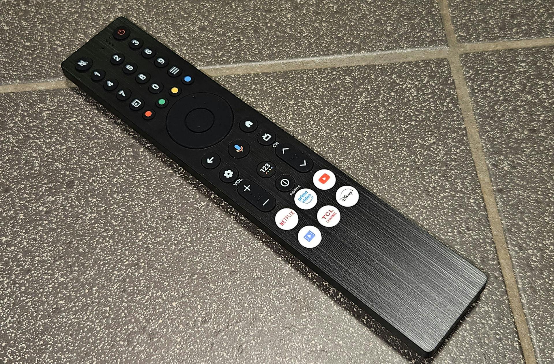 De zwarte rechthoekige afstandsbediening wint geen prijs voor innovatie, maar werkt wel prima. De toetsen voelen zacht aan en hebben een zuivere aanslag. De lay-out is redelijk klassiek en er is nog een numeriek toetsenbord aanwezig. De ingebouwde microfoon is handig voor zoekopdrachten. Onderaan de afstandsbediening zijn zes sneltoetsen te vinden: voor Netflix, Prime Video, YouTube, de mediaspeler, TCL Channels en Disney+.