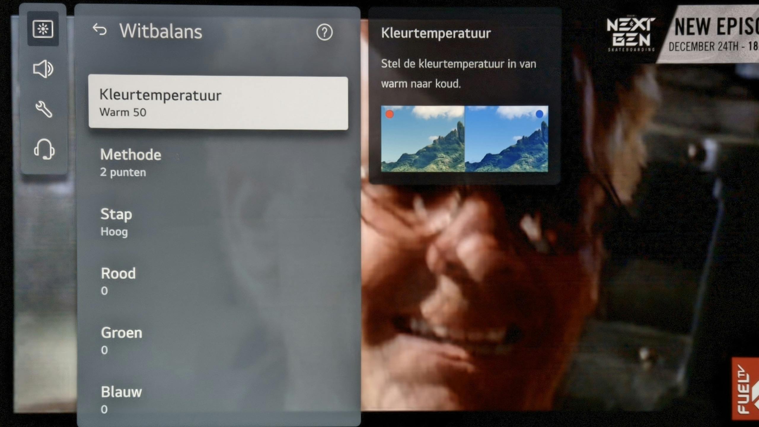 Een meer correcte kleurweergave krijg je bij een warme kleurtemperatuur. De instelling waar je naar op zoek gaat is Kleurtemperatuur, soms ook te vinden onder de benaming Witbalans of Witpunt. De instelling zelf gebruikt als mogelijke opties vaak termen als Warm of Koud. Verander ze naar de instelling die je bij de Film-modus vond. Eventueel zet je ze één stap in de richting van een koelere kleurtemperatuur voor een iets frisser en levendiger beeld.