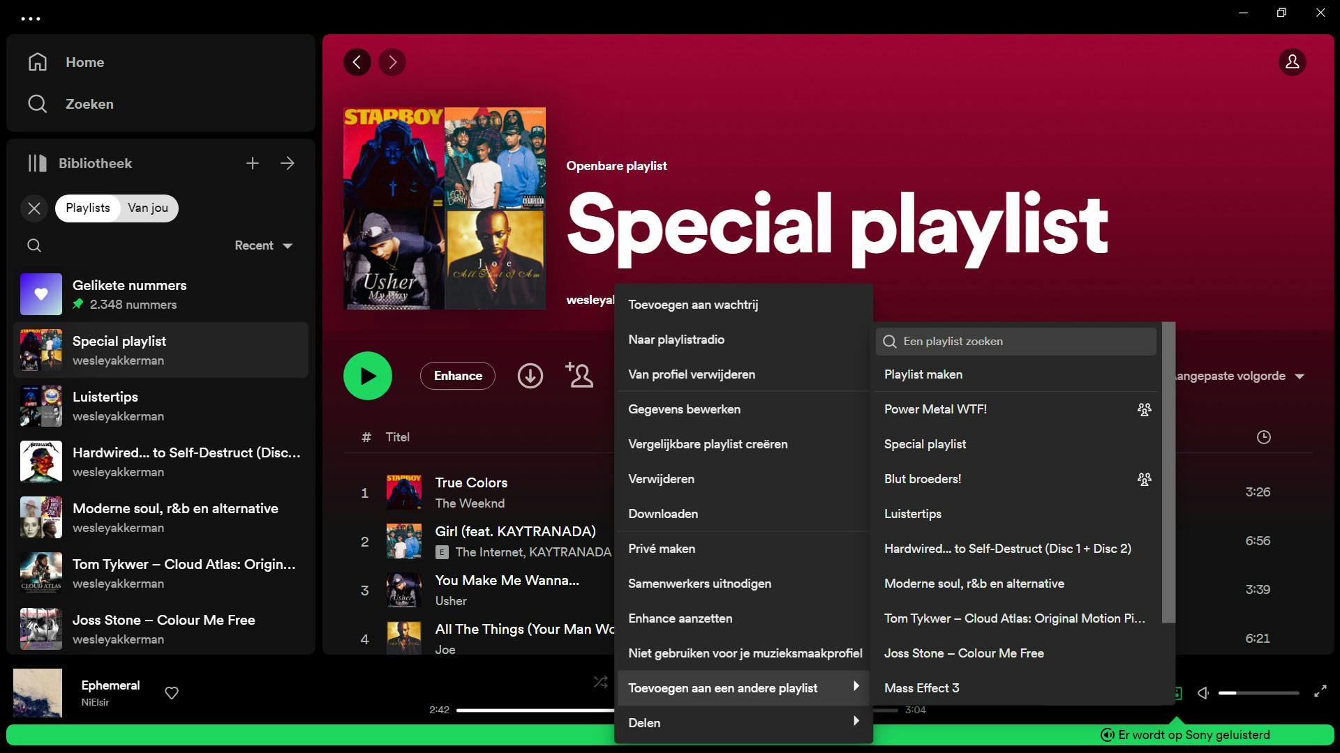 - Beweeg de muis nu naar Toevoegen aan playlist en selecteer in het contextuele menu een lijst waaraan je deze verzameling wil toevoegen. Na het selecteren bevestigt Spotify je keuze middels een pop-up.