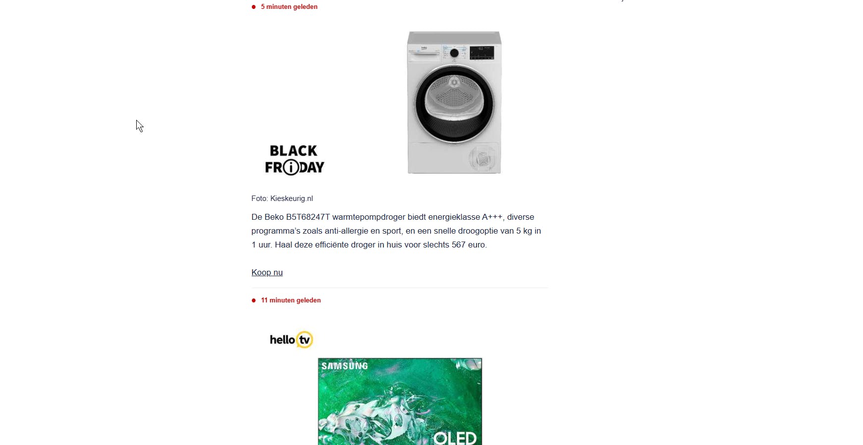 Van televisies tot espressomachines, van elektrische tandenborstels tot smartphones, van laptops tot airfryers: vandaag is dé dag om toe te slaan. Maar het vinden van de beste deals kan (iets met door de bomen en bos) best nog ingewikkeld zijn. Gelukkig hoef je dat niet allemaal zelf te doen. Op Nu.nl wordt de hele dag live over de beste deals geblogd. Aan de achterkant zit een team van dealspotters van vergelijkingssite Kieskeurig.nl. Zien zij een aanbieding die je echt niet mag missen, dan voeren ze die meteen in. Handig: dat bespaart jou een hoop zoekwerk. Fijne Black Friday!