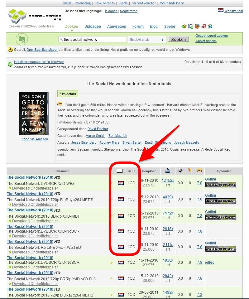 Typ de naam van de film in waar je de ondertiteling voor zoekt (in dit voorbeeld zoeken we die voor The Social Network). Je krijgt dan een lijst te zien met verschillende ondertitelingen die je kunt downloaden.