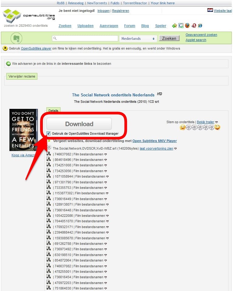 Je komt nu op de pagina waar je het bestand kunt downloaden, maar LET OP! Voor je verleidelijk op de grote knop met DOWNLOAD klikt, moet je wel het vinkje uitzetten bij 'Gebruik de OpenSubtitles Download Manager'. Doe je dit niet, dan download je eerst een totaal nutteloos programma om dáár vervolgens het ondertitel-bestand mee te downloaden. Omslachtig dus, maar als je dit vinkje uitzet is er niets aan de hand.