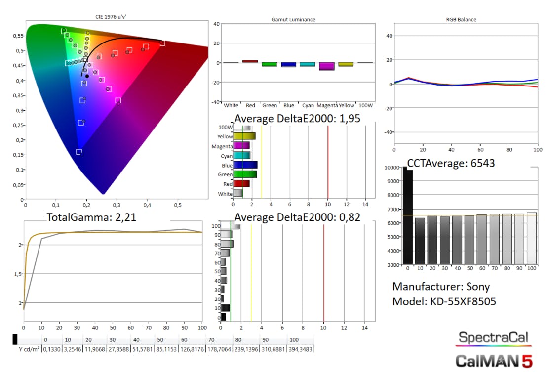 Alle metingen voeren we uit met SpectraCal CalMAN Ultimate, een SpectraCal C6 HDR2000 colorimeter en VideoForge Pro patroongenerator. Voor sdr-beelden (standard dynamic range) evalueren we de grijsschaal, die bepaalt of het hele bereik van licht tot donker dezelfde tint heeft en de juiste kleurtemperatuur. Een correcte kleurtemperatuur (6500 K) garandeert een correcte algemene kleurweergave. Lage waardes maken het beeld iets roder, hoge waardes iets blauwer. De EOTF-curve (gamma) bepaalt of het verloop van donker naar licht correct is, we mikken op een gamma-waarde van 2,2-2,4. Te hoge waardes maken het beeld donkerder, te lage maken het lichter. Kleurbereik, saturatieverloop van de kleuren en een algemene kleurtest bepalen hoe goed het scherm kleur weergeeft. We meten contrast op een patroon met gemiddelde helderheid van 18% (APL18).