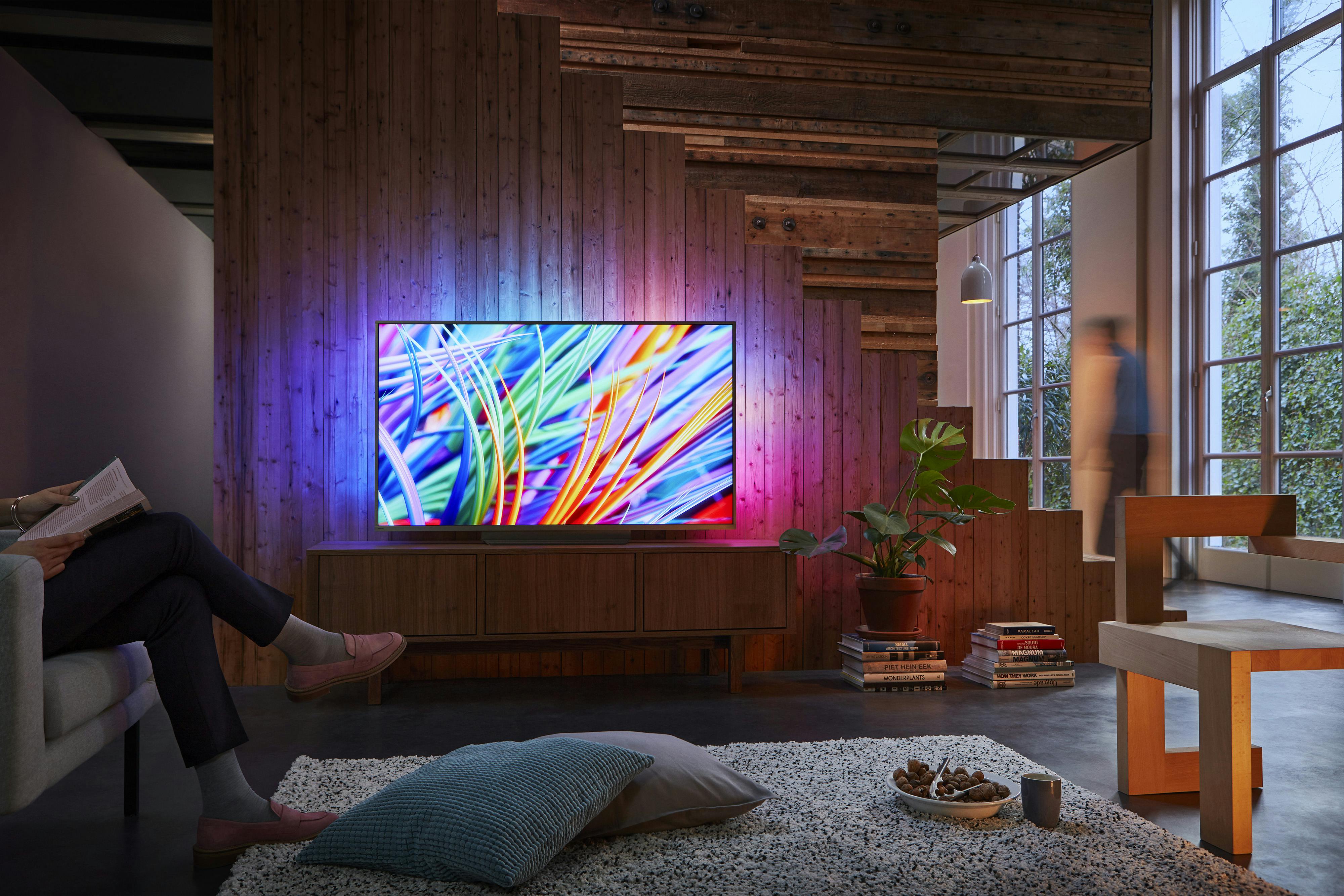 Het Philips-ontwerp springt in het oog door het gebruik van een lichtmetalen kader, en een gedeeltelijk in transparant plastic uitgevoerde voetplaat. De Ambilight-sfeerverlichting is een unieke Philips-eigenschap. Naast het algemene Android Home-scherm biedt Philips een extra menu dat een prima alternatief is om snel een andere ingang te kiezen, live tv-functies te selecteren of de mediaspeler te starten. De afstandsbediening is aan de achterzijde uitgerust met een bluetooth-toetsenbord, maar je kunt zoekopdrachten ook inspreken.