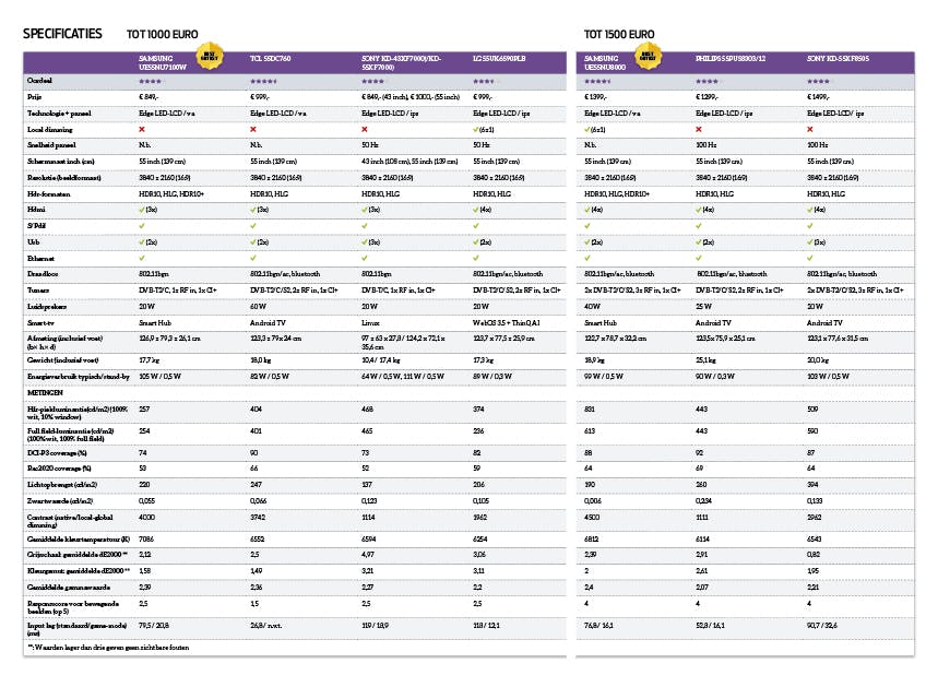 Als tweede criterium leggen we de prijs op ongeveer 1.000 euro. Daarmee kunnen we in het 2018-aanbod nog net wat vinden in de wat lager geplaatste modellen. Omdat we toch ook televisies met recente snufjes wilden testen, hebben we een tweede categorie tot 1500 euro toegevoegd.