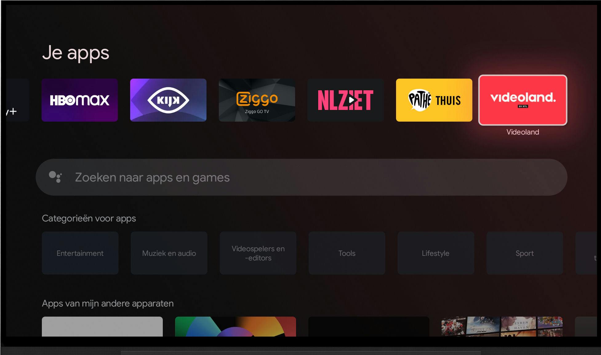 Net als iedere streaming-app die je op een smart-tv aantreft, heeft ook de Videoland-app een handige zoekfunctie waarmee je snel en eenvoudig films, series, documentaires en andere programma's kunt vinden. In dit artikel leggen we stap-voor-stap uit hoe je de zoekfunctie gebruikt. Je opent natuurlijk eerst de Videoland-app. Die vind je - afhankelijk van je merk en type smart-tv - doorgaans op de thuispagina, maar kan soms ook verborgen zitten achter een bepaalde menu-categorie, zoals Mijn apps.