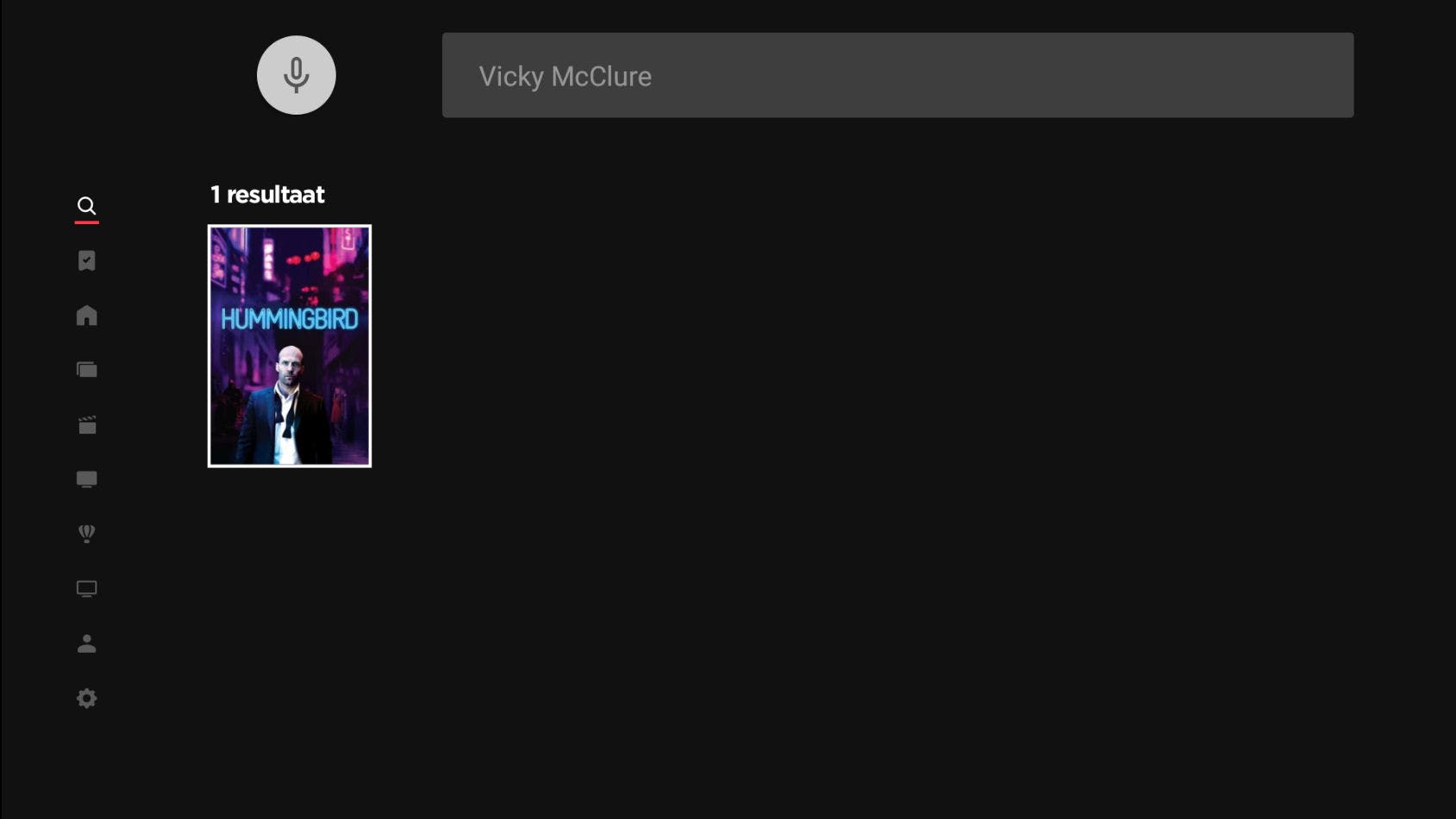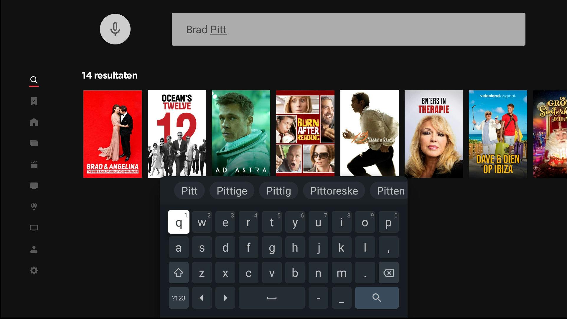 Is de app gestart, dan zie je het startscherm met daarop onder meer aanbevolen titels, bladersuggesties en onlangs beken films en series. Om de zoekfunctie te gebruiken ga je naar het zoekscherm. Dit doe je door in de Videoland-app aan de linkerkant naar het vergrootglas-icoon gaan en deze te selecteren met de OK-toets op je afstandsbediening.