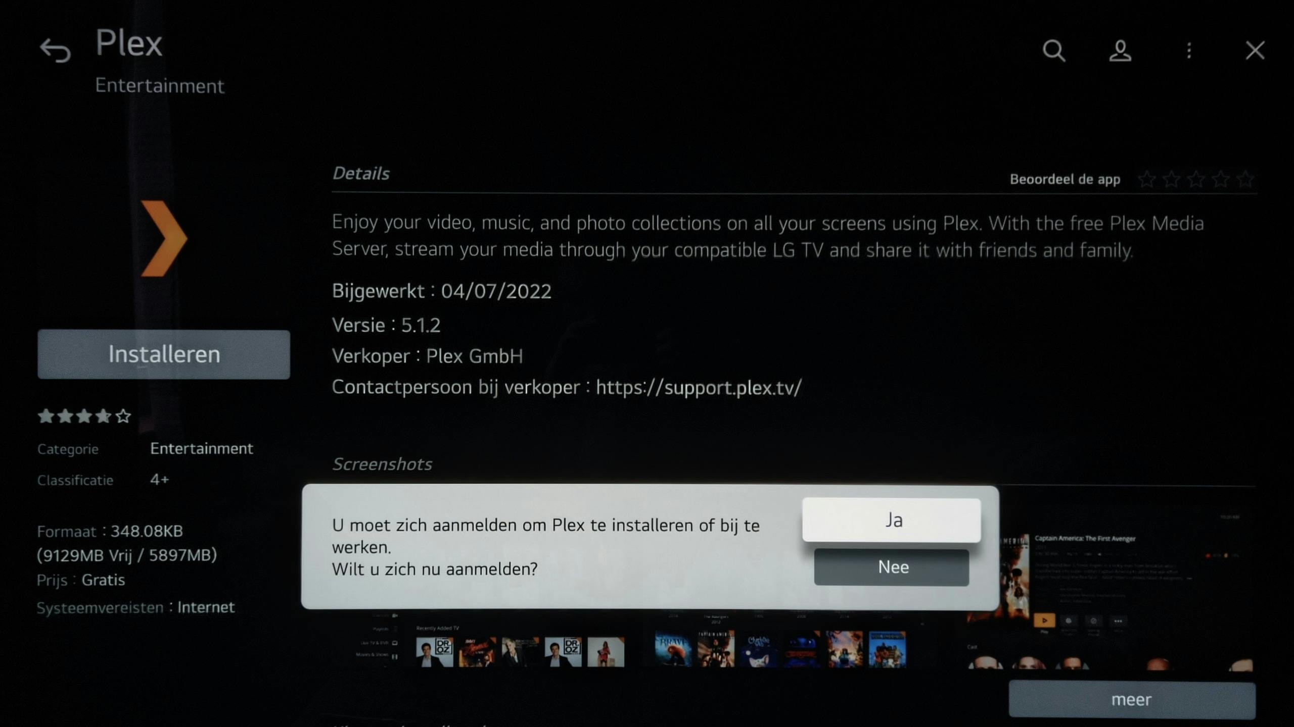 Als je een app hebt gekozen, dan vind je op de pagina van die app de informatie over de functionaliteit, systeemvereisten, hoeveel schijfruimte hij inneemt, een aantal screenshots en LG geeft zelfs wat verwante apps aan. Installeren is eenvoudig, klik links bovenaan op de ‘Installeren’-knop. Onderaan links op dit scherm kan je zien hoeveel ruimte er nog vrij is op de interne opslag.