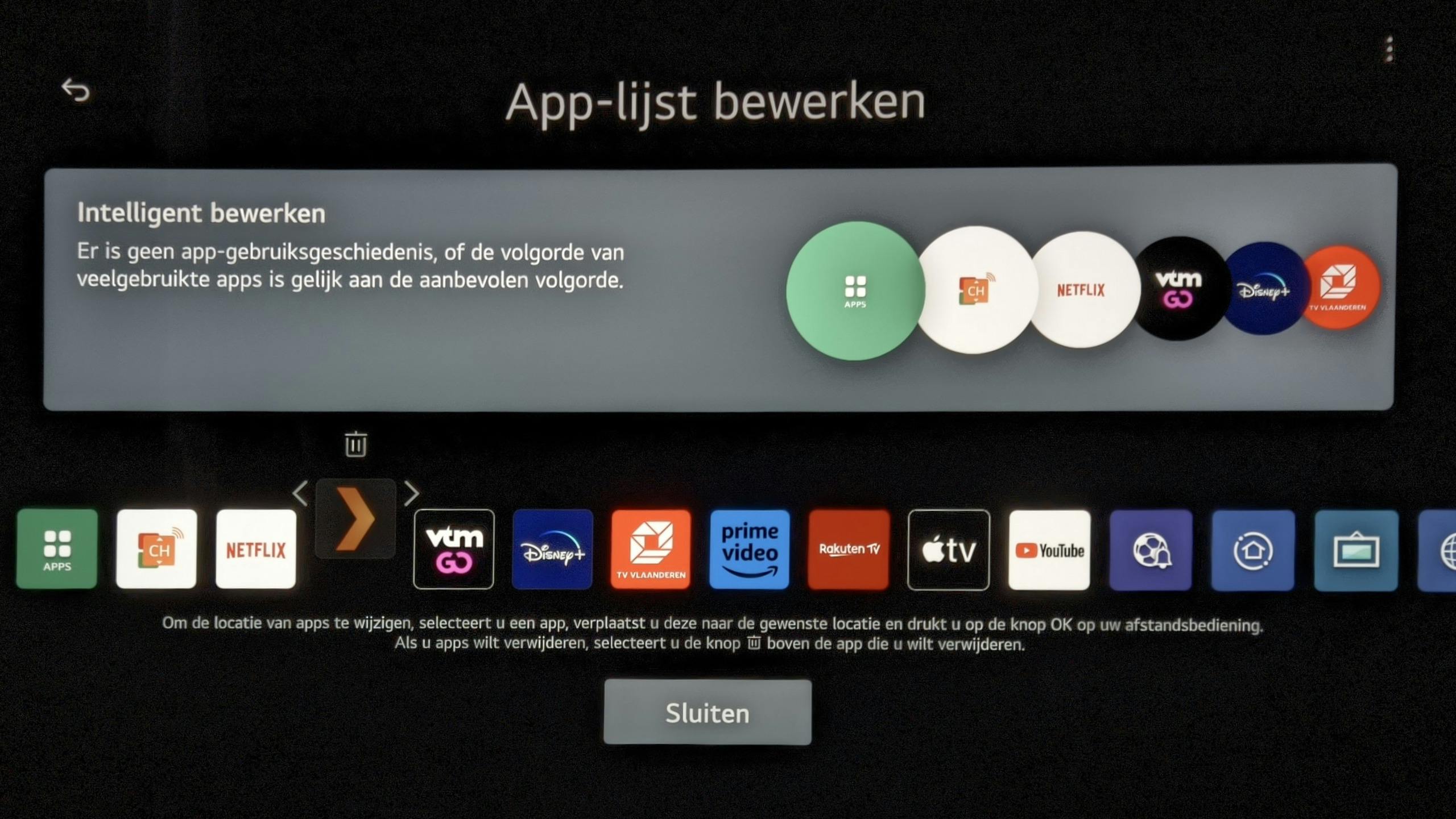 Na installatie staat de app standaard helemaal achteraan in de rij apps op het Home-scherm. Scroll naar rechts in die rij tot je de app ziet. Het laatste pictogram klik je aan om de lijst te bewerken. Klik de app aan die je wil verplaatsen, sleep hem naar de gewenste positie en klik opnieuw om hem daar vast te zetten.