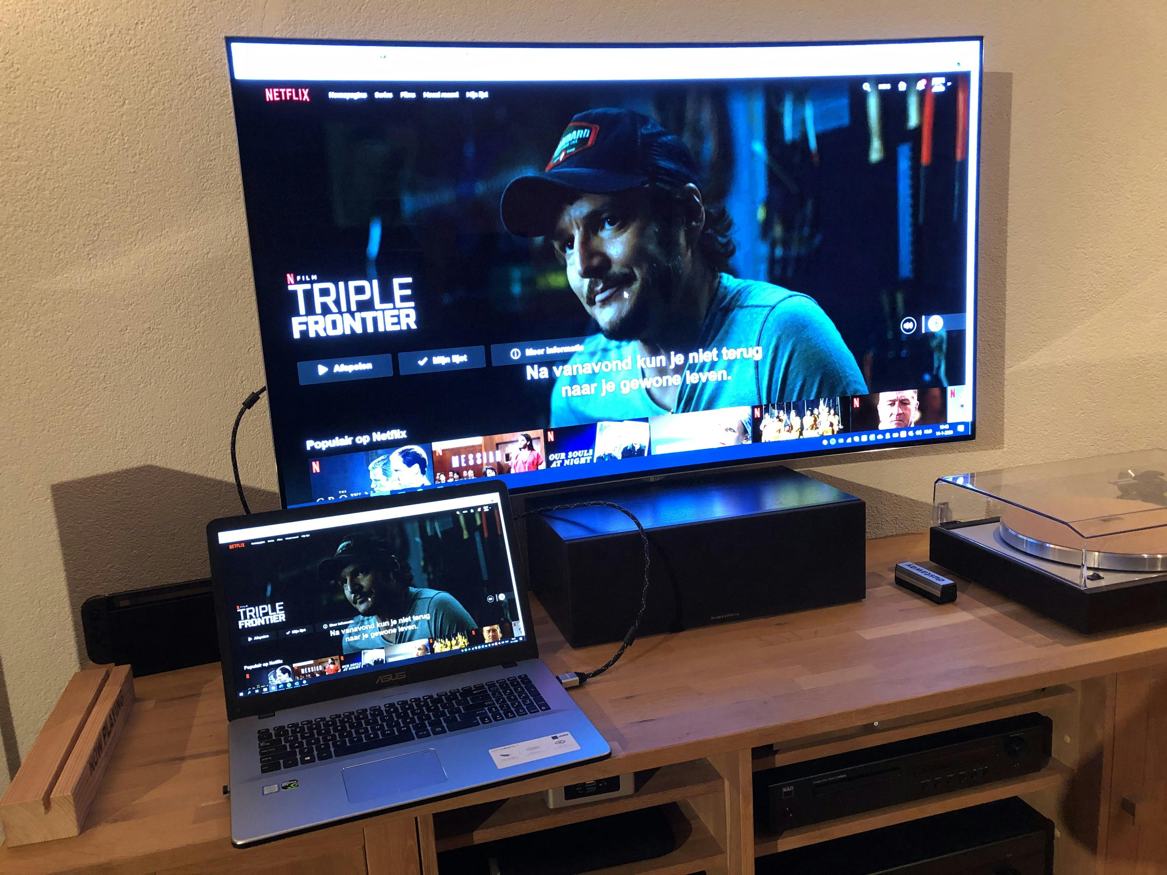 Het is weliswaar niet zo’n elegante oplossing, maar je kunt natuurlijk ook gewoon een laptop op een televisie aansluiten en vervolgens films streamen. Veruit de meeste laptops bezitten hiervoor een hdmi-uitgang. Bijna iedere streaming-videodienst is beschikbaar in een webomgeving, dus die tover je moeiteloos op het grote scherm. Dupliceer je namelijk de inhoud van je laptopscherm, dan kijk je de bewuste film of serie op groot formaat. Als het goed is, herkent Windows 10 een aangesloten scherm automatisch. Schakel met de afstandsbediening van de televisie de juiste bron in.