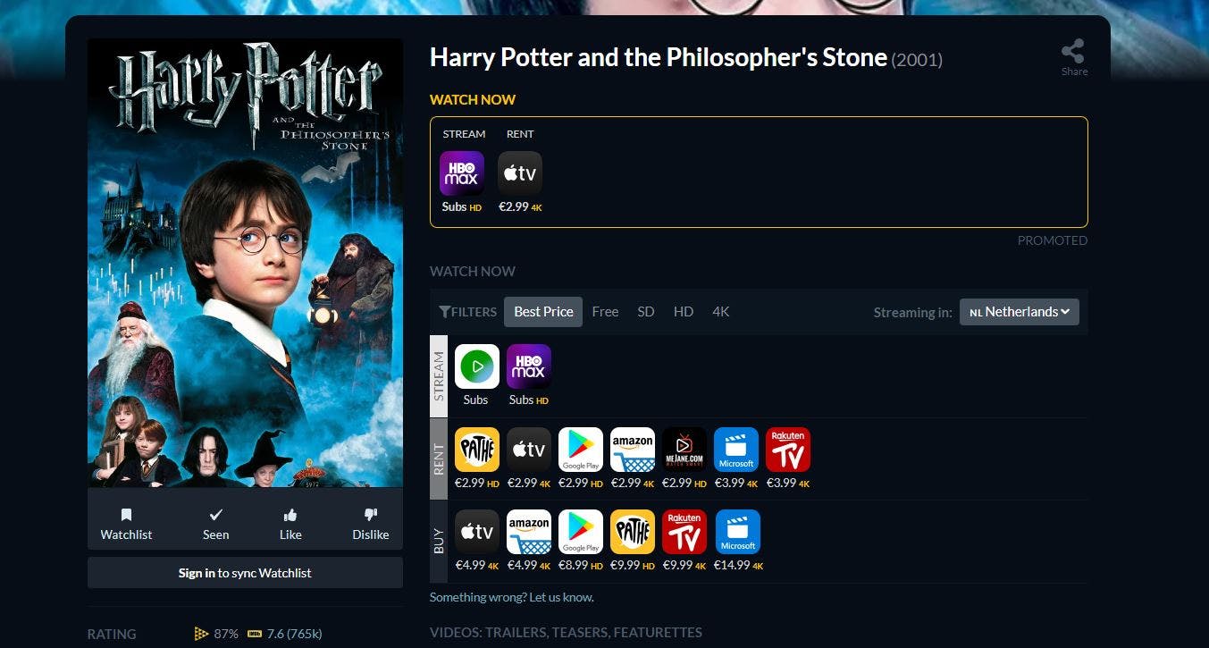 Heb je overigens wel een account bij JustWatch, dan kun je een kijklijst bijhouden. Handig als je vaak vergeet welke films of series je ook alweer wilde zien. Klik daarvoor op de Watchlist-knop. Dit werkt ook in de bijbehorende app.