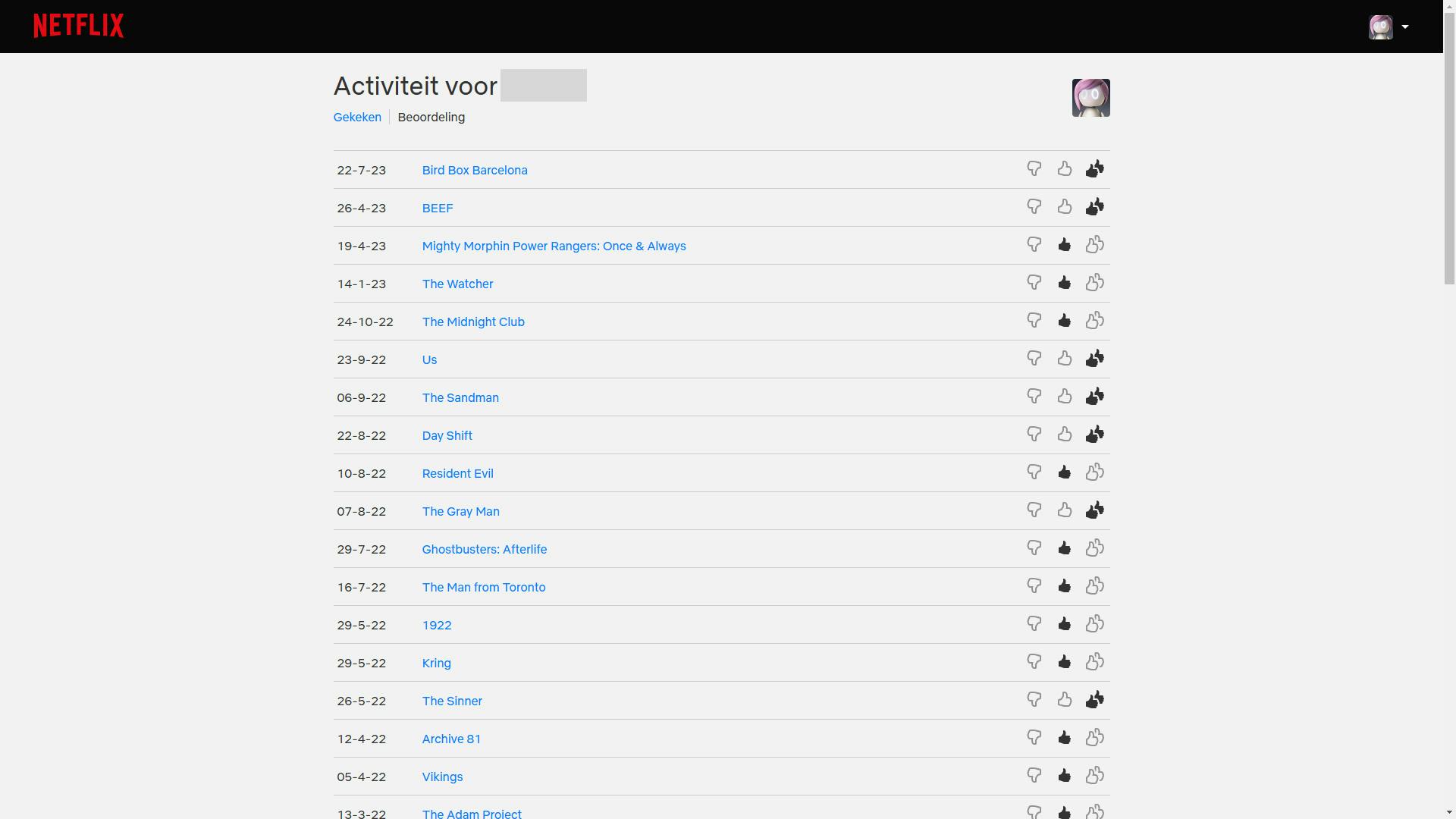 Daarnaast baseert Netflix zijn aanbevelingen op basis van beoordelingen die je geeft. Je kunt films, series en andere content een duimpje omlaag 👎🏼, duimpje omhoog 👍🏼 en twee duimpjes omhoog 👍🏼👍🏼 geven om je waardering te laten blijken. Het algoritme weet dan wat je van de content vindt. Soms kijk je wel iets, maar vond je dat niet leuk en dat is het stom als je ineens allerlei aanbevelingen krijgt die niet bij je passen. Gelukkig kun je de beoordeling aanpassen wanneer je wilt. Dat kan via de app (via de serie of film) of via de accountpagina's.