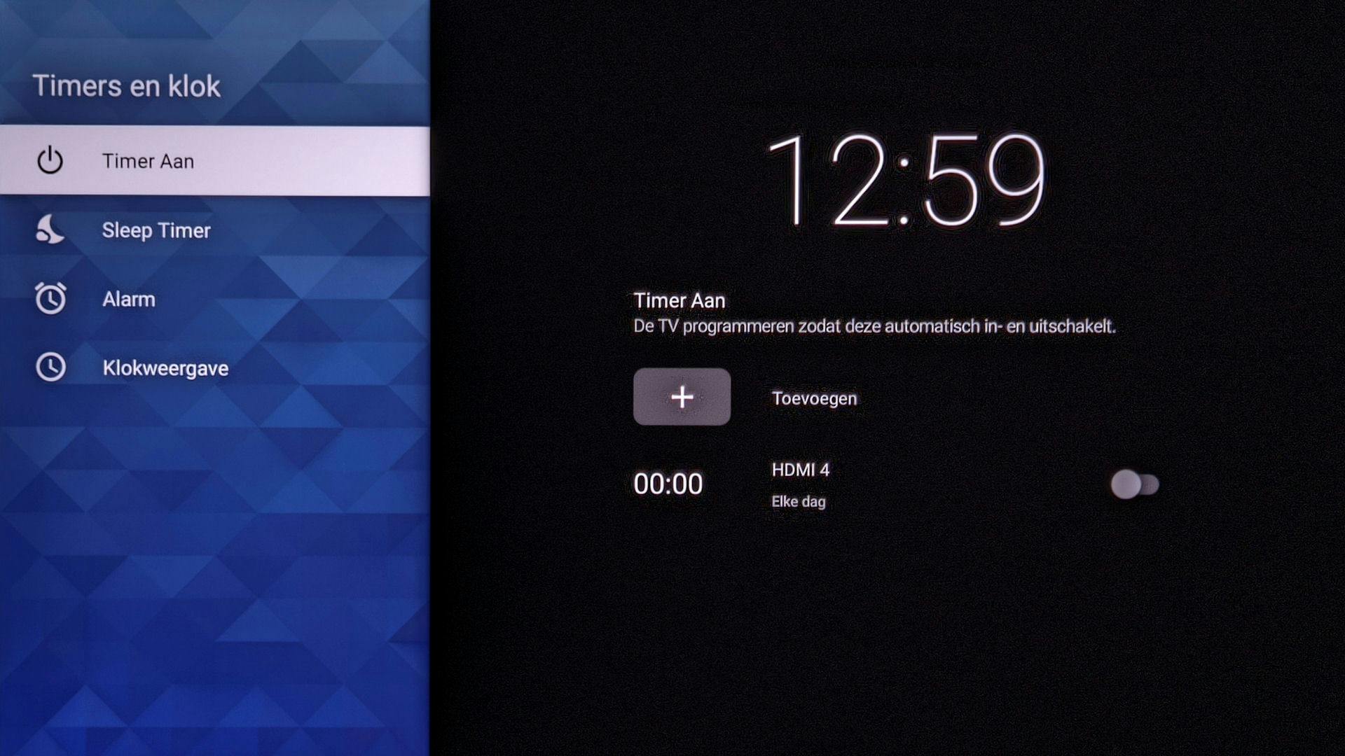 Een andere optie die Sony biedt is het automatisch inschakelen van de televisie. In het menu van de snel-instellingen vind je naast de slaaptimer ook de Timer Aan-functie. Daarmee kun je de Sony-tv automatisch aanzetten. Je kunt dan kiezen wanneer de tv moet aanspringen en of dat herhaald moet worden. Ook handig is dat je het startvolume en de bron kunt selecteren. Via dit menu kun je verder ook de sleeptimer en een alarm configureren. Een alternatieve manier om het te bereiken is via de algemene instellingen, Systeem > Datum en Tijd > Klokweergave.