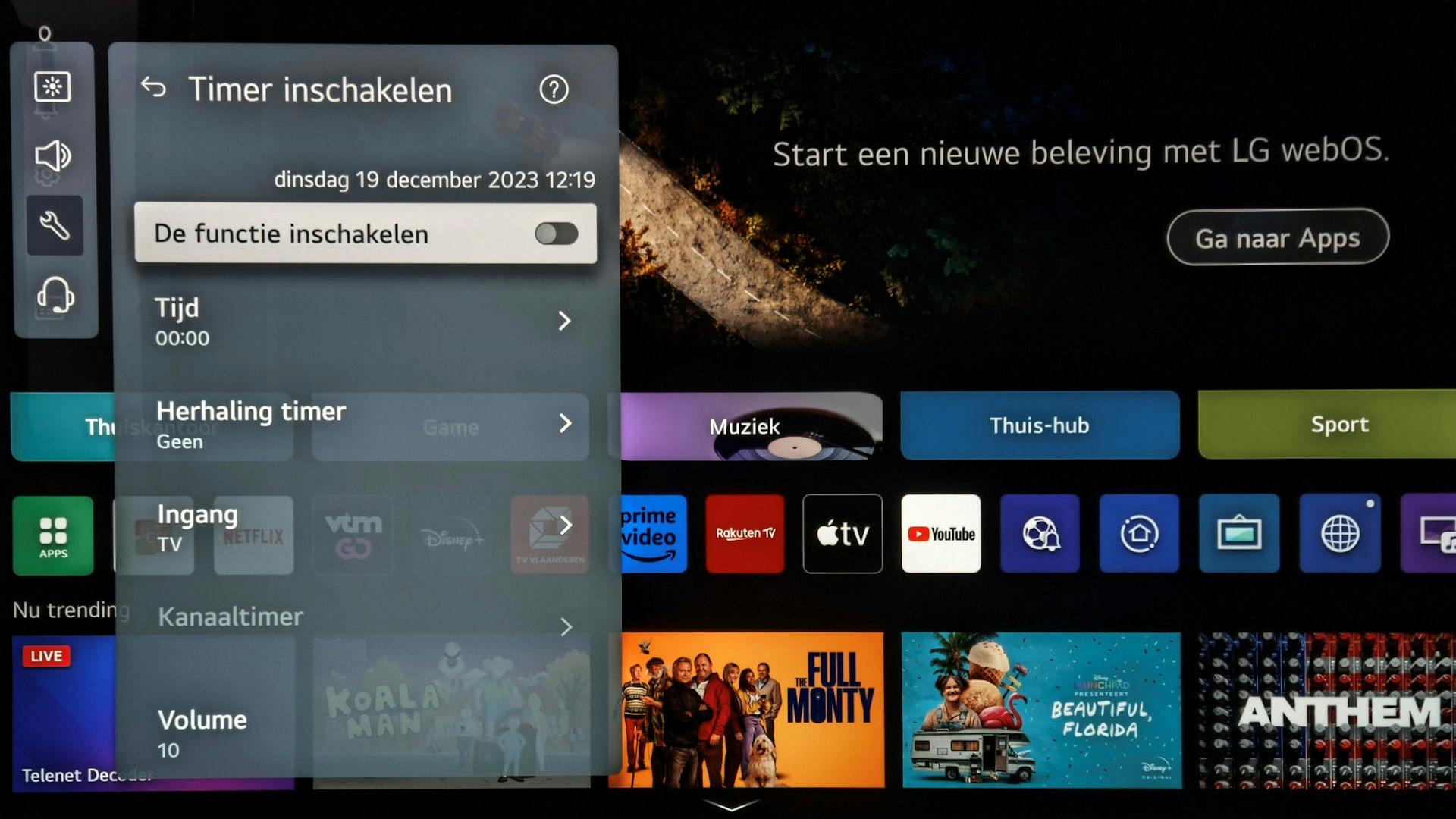 Bij LG is het ook mogelijk om de televisie automatisch aan te laten gaan op een bepaalde tijd. Je kunt aangeven of dit ook herhaald moet worden en je kunt instellen op welke tv-uitgang het toestel moet aanspringen en hoe hard het volume moet staan.