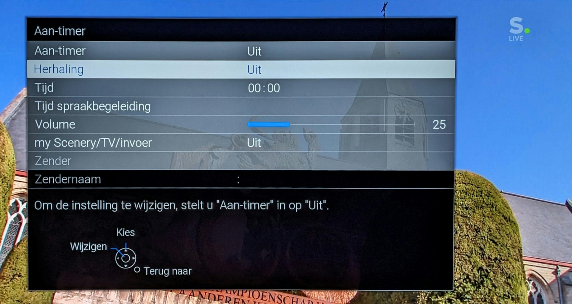 Ook bij Panasonic is het mogelijk om de televisie op een vooraf ingestelde tijd te laten aanspringen. Ga dan één menu-item terug, en selecteer vervolgens de optie Aan-timer.