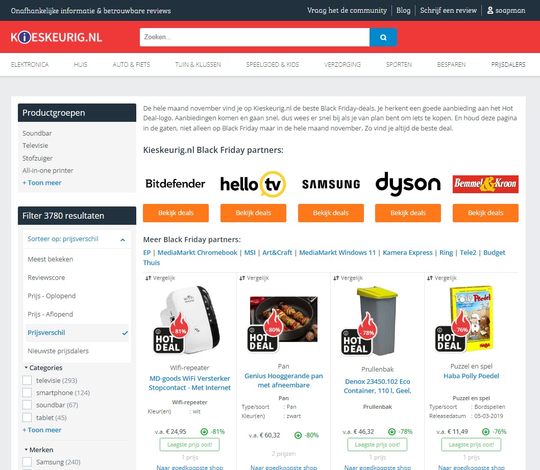 Direct op de homepage van onze product- en prijsvergelijker Kieskeurig.nl vind je in deze periode een overzicht van alle aanbiedingen. Een goede deal herken je aan het logo Hot Deal. Maar in deze tijden is natuurlijk alles een goede deal. Dus hoe vind je procentueel de hoogste daling? In het menu bij de producten staan diverse filteropties. Standaard staat deze op Sorteer op: Meest bekeken. Klik hierop en kies voor de filteroptie Prijsverschil. Het systeem past automatisch het filter toe waarbij de hoogste korting als eerste wordt getoond.