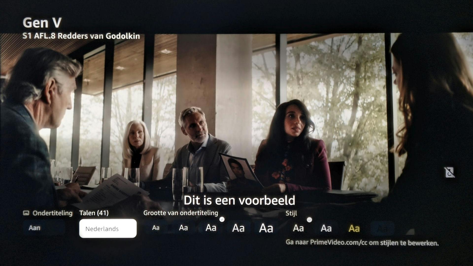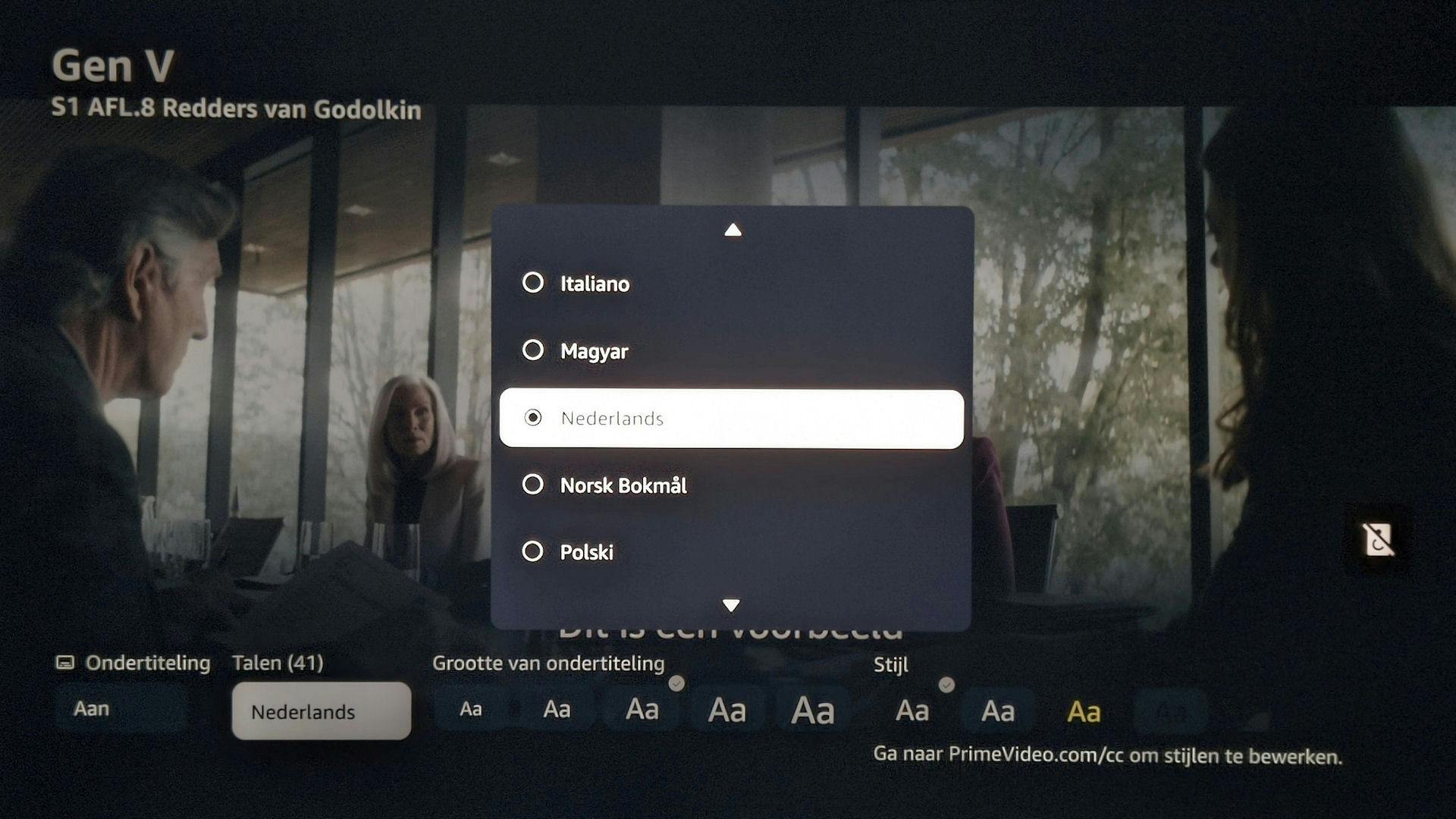 Ook handig bij Amazon Prime is de mogelijkheid om de grootte van de tekst van de ondertiteling aan te passen. Dat kan direct vanuit hetzelfde scherm waar je de ondertitels wijzigt. Je gaat dan met de navigatietoetsen van je afstandsbediening naar de rechterkant en verschuift de balk naar de grootte waarin je het lettertype wilt hebben.