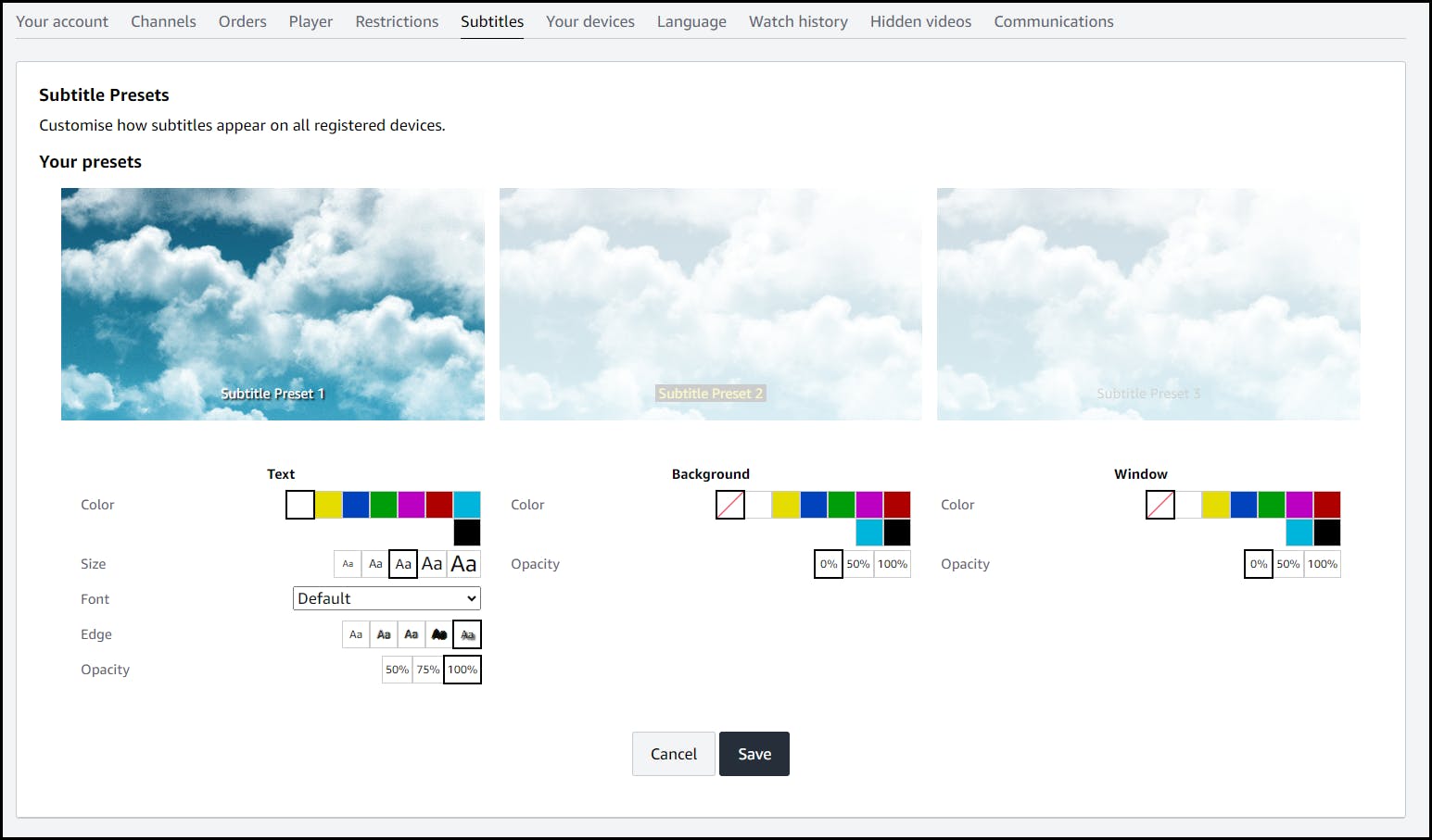 Als Amazon Prime-lid heb je verder ook de mogelijkheid om je ondertitels helemaal naar eigen hand te zetten, maar dat kan alleen vanuit een browser. Ga maar eens naar primevideo.com/cc en je ziet verschillende mogelijkheden om een eigen vormgeving voor je ondertitels samen te stellen. Alles wat je hier aanpast, wordt doorgevoerd in Amazon Prime Video en toegepast op alle content waarin je ondertiteling gebruikt.