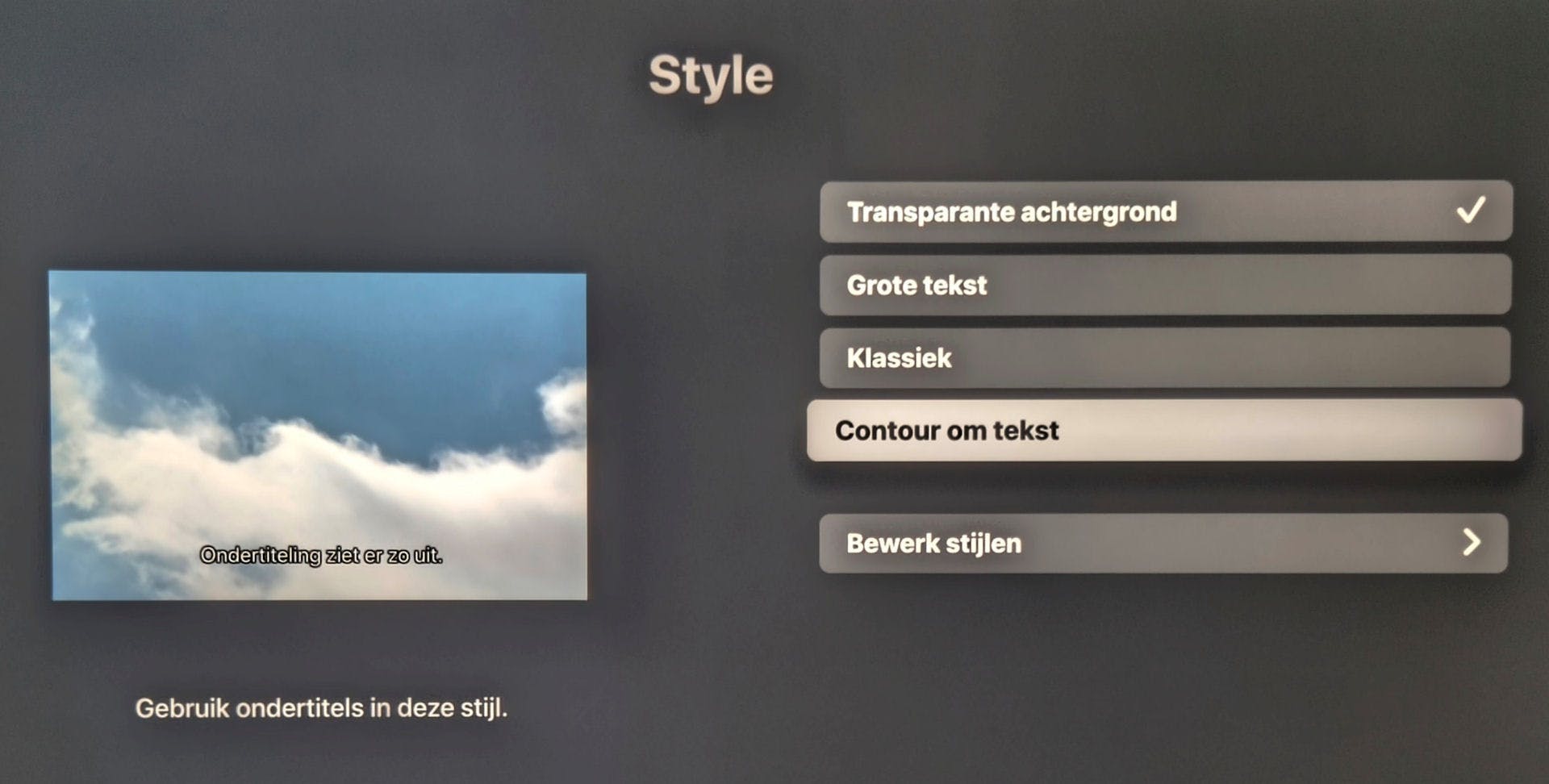 Wil je de stijl aanpassen, navigeer dan in de instellingen naar Toegankelijkheid, vervolgens naar Horen/Ondertiteling en dan naar bijschriften/Style. Daar kun je een van de vier bestaande stijlen selecteren, of je kunt een volledig nieuwe stijl maken via het menu Bewerk Stijlen.