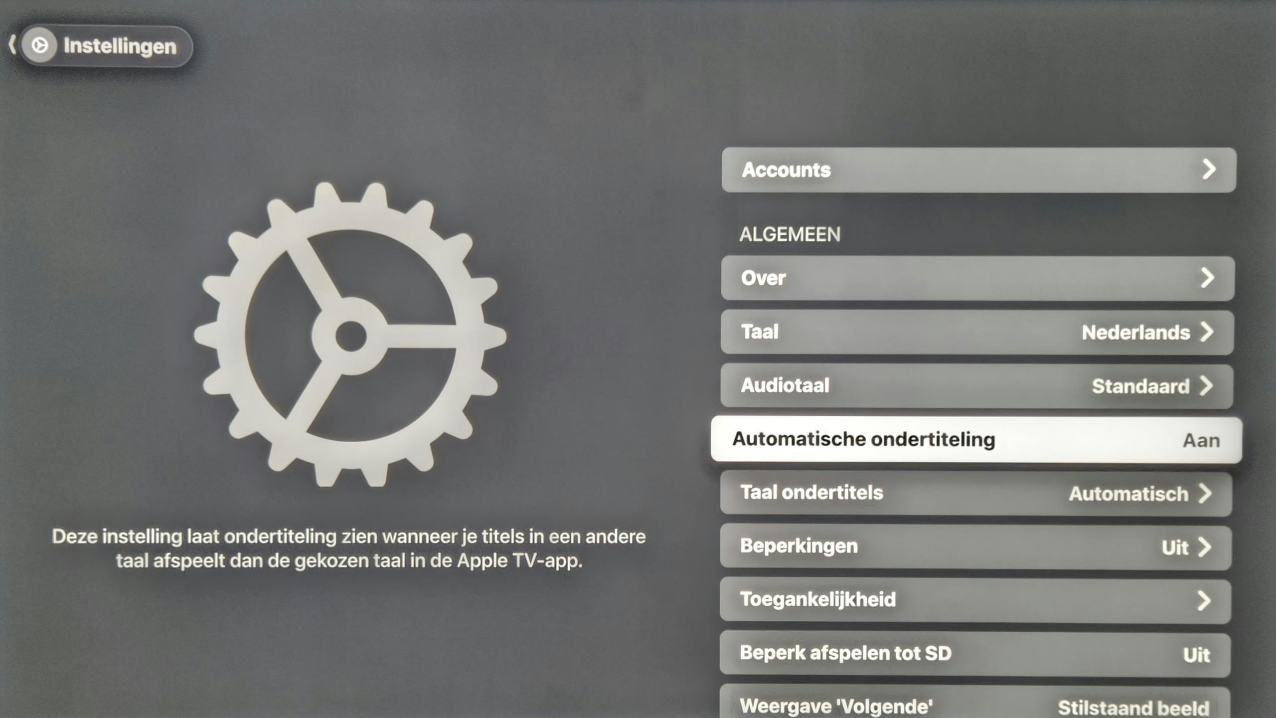 Vanuit het Home-scherm van Apple TV+ kun je ook naar het instellingenmenu navigeren. Onder het onderdeel Algemeen vind je de instellingen voor Audiotaal, Automatische ondertiteling en Taal ondertitels. Die kun je hier veranderen voor alle volgende video’s.