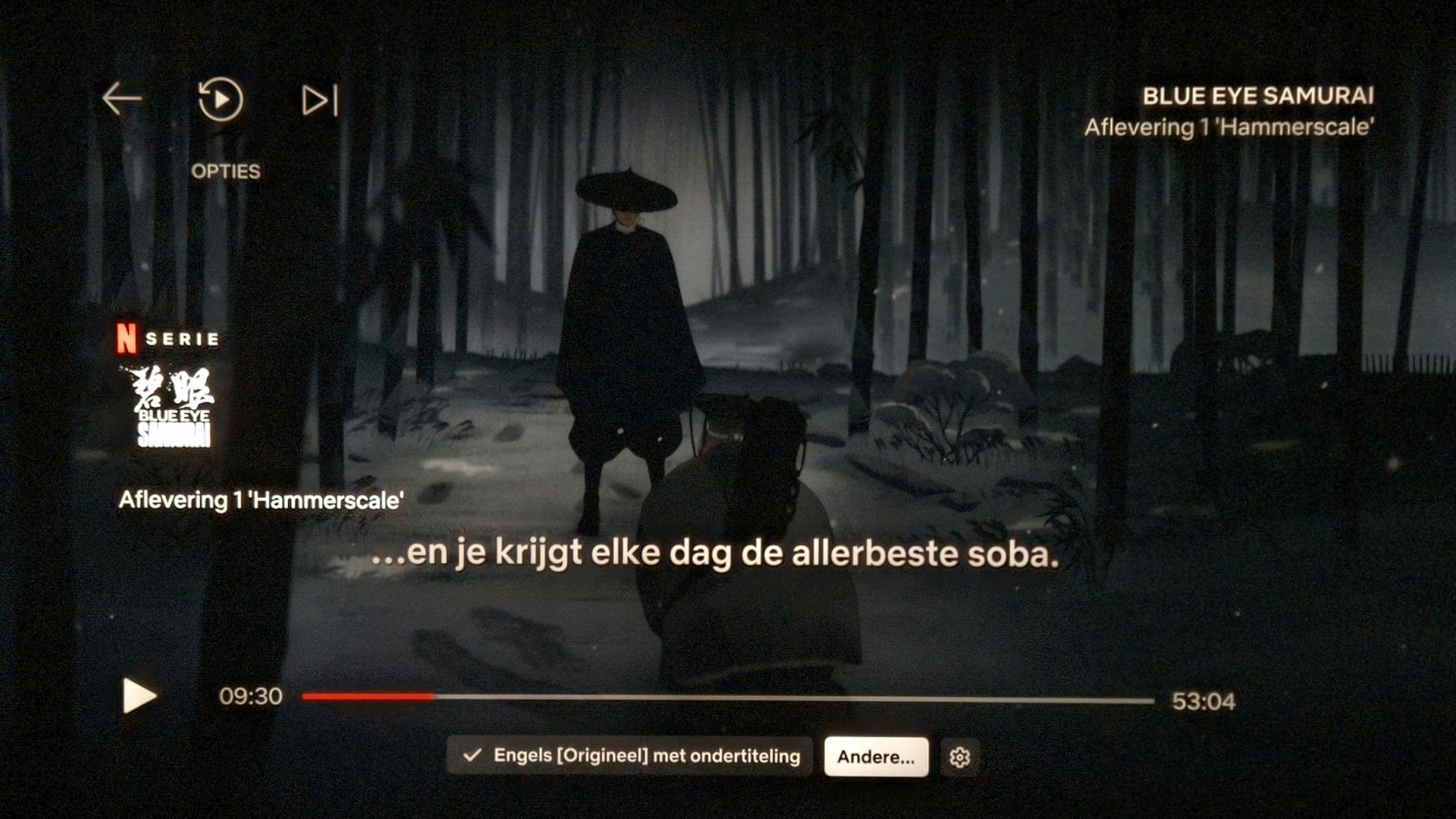 In Netflix druk je eerst op de pauzetoets (of de OK-toets) op de afstandsbediening. Onderaan in beeld zie je het geselecteerde audiospoor en de ondertiteling, met daarnaast het pictogram Andere... en uiterst rechts het instellingenpictogram in de vorm van een tandwieltje.