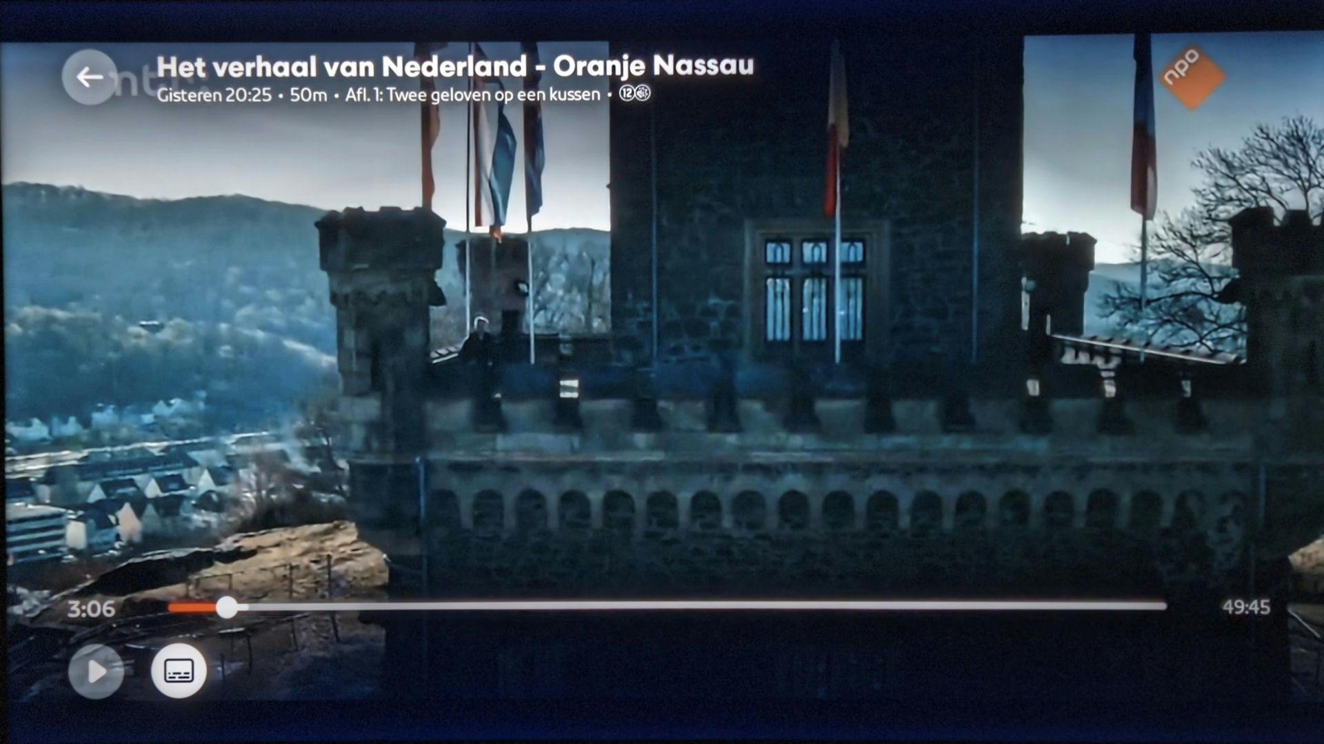 In Videoland pauzeer je de video, en als er ondertitels zijn, zie je in het midden links het pictogram voor de ondertitels. Het viel ons hier overigens wel op dat er voor veel programma's geen ondertitels zijn. In al die gevallen is er dan ook geen pictogram zichtbaar.