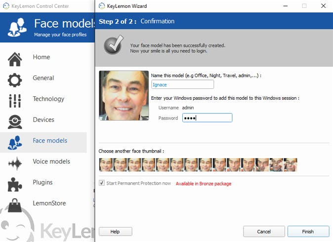 Na de installatie start je KeyLemon Control Center op en klik je bij Face op Set up now en op Create your face profile. Kijk nu recht in de cameralens, bevestig met Create a new face model en met Next step. Selecteer een van de beschikbare miniatuurfoto's, geef het model een naam, kies het bijhorende Windows-account en rond af met Finish. In principe ben je nu klaar en kun je meteen gaan testen: druk op Windows-toets+L en ontgrendel je Windows-sessie door even naar de camera te blikken. Of toch maar door je wachtwoord in te voeren mocht de biometrische authenticatie onverhoopt niet blijken te werken.