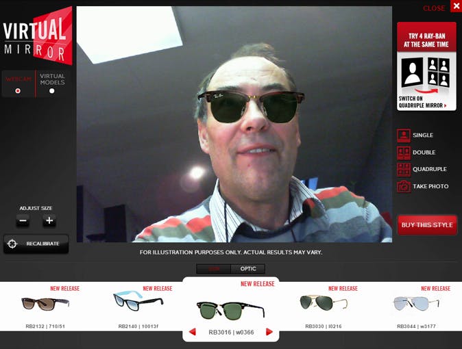 Augmented reality is de combinatie van virtuele objecten en (wat we ervaren als) de echte werkelijkheid. In ManyCam heb je al voorbeelden van dergelijke combinaties kunnen zien, zoals een virtuele hoed die op je hoofd wordt geplaatst en die tijdens het streamen van de beelden ook effectief de bewegingen van je hoofd volgt. Ook bedrijven hebben de afgelopen jaren kleinschalige augmented reality-projecten uitgevoerd in combinatie met webcams, zoals de virtuele spiegel van (zonne)brillenfabrikant Ray-Ban. Surf hiernaartoe, bevestig met I accept, selecteer desgevraagd de gewenste webcam en geef de site toestemming die te gebruiken. Kijk in de camera en klik een van de beschikbare brillen aan: een virtuele spiegel!