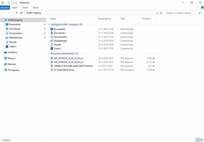 Een handig nieuw onderdeel in Verkenner in Windows 10 is Snelle toegang. Dit onderdeel vult zichzelf automatisch met de mappen en bestanden die je het meest gebruikt. De mappen die door de Snelle toegang zijn geselecteerd staan links in het verkennervenster. Mappen die zich melden in de lijst Snelle toegang en die je echt vaak gebruikt, kun je daar vastpinnen. Ze blijven dan altijd daar in de lijst staan, ook als je ze eens wat minder gebruikt.