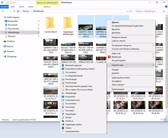 Een bekende functie in Windows Verkenner is het submenu Kopiëren naar uit het contextmenu dat verschijnt wanneer je met de rechtermuisknop op een of enkele bestanden of mappen klikt. Het menu bevat standaard een handvol opties zodat je het bestand snel naar het Bureaublad of de map Documenten kopieert, of verstuurt als bijlage van een mailtje of naar een bluetooth-apparaat. Druk je echter eerst de Shift-toets in en klik je dan pas met de rechtermuisknop op de geselecteerde bestanden, dan krijgt het submenu een veel grotere lijst met meer mogelijkheden. Zo kopieer je je bestanden ook gemakkelijk naar andere standaardmappen of naar OneDrive.
