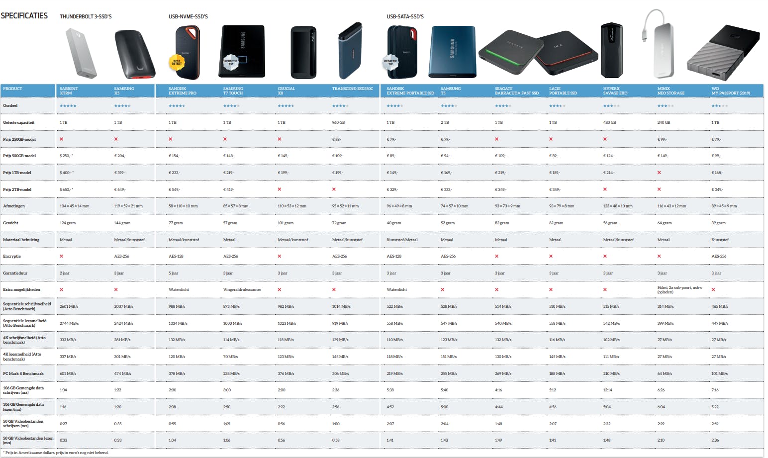Een bekend gezegde is dat er weinig echt slechte producten zijn, maar vooral slechte prijzen. En zeker bij externe ssd’s, die vooral door hun aansluiting en interne interface worden beperkt, zit daar een kern van waarheid in. Een enkeling valt echt buiten de boot dankzij wat mindere prestatie, maar de ssd’s ontlopen elkaar binnen hun klasse weinig. Het is dus vooral zaak om goed na te denken over wat belangrijk is voor jouw gebruik. Geef je vooral om een ssd om vanaf te werken, kijk dan goed naar de ATTO 4K-benchmarkresultaten en de score in PC Mark 8. Zet je vooral veel data over, kijk dan naar de overdrachtstijden in de verschillende benchmarks. Dat gezegd hebbende, zien we een aantal positieve uitschieters. Zoek je vooral een betaalbare drive, dan zijn de Samsung T5 en SanDisk Extreme Portable SSD goede opties, waarbij de nipt lichtere en waterdichte SanDisk onze redactietip weet te pakken. Zoek je een nvme-variant om alles uit een snelle usb Gen 2-aansluiting te halen, dan tonen de SanDisk Extreme Pro Portable en de Crucial X8 zich daar de snelste. We geven de award wederom aan SanDisk vanwege de waterdichtheid en de encryptie. Let op: beide moeten niet veel duurder zijn dan de Transcend of de Samsung T7 Touch die hen op de hielen zitten. Die laatste krijgt van ons een redactietip, want een vingerafdrukscanner als beveiliging werkt een stuk soepeler dan de softwareoplossing die anderen gebruiken.
