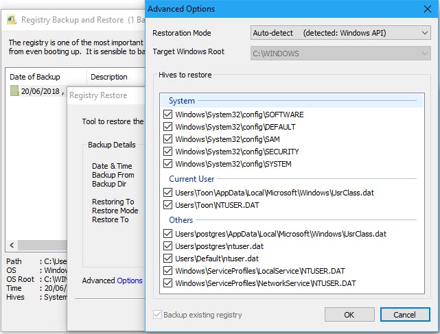 Wil je echt zo’n tool toch gebruiken, zorg dan eerst voor een back-up van het systeem of het register. Eén van de betere tools is RegBak. Klik op Click here to view details en zet bij voorkeur ook een vinkje bij Others. Bevestig met OK, druk op New Backup, geef een doellocatie aan en klik op Start. Een back-up terugzetten is simpel: selecteren en Restore aanklikken. Via Options bepaal je zelf welke register-onderdelen je herstelt.