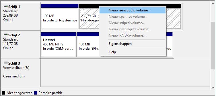 Beschik je inderdaad over een enkele partitie en wil je alsnog ruimte creëren voor een nieuwe datapartitie, druk dan op Windows-toets+R en voer diskmgmt.msc uit. De module voor Schijfbeheer opent zich. Hier klik je de partitie met de rechtermuisknop aan, waarna je Volume verkleinen kiest en aangeeft met hoeveel MB je die wilt verkleinen. Vervolgens creëer je vanuit het contextmenu van de Niet-toegewezen ruimte een afzonderlijke datapartitie via de optie Nieuw eenvoudig volume. In principe verloopt deze operatie zonder gegevensverlies, maar vooraf een complete systeemback-up maken lijkt ons toch wel aangewezen. Murphy, weet je wel.