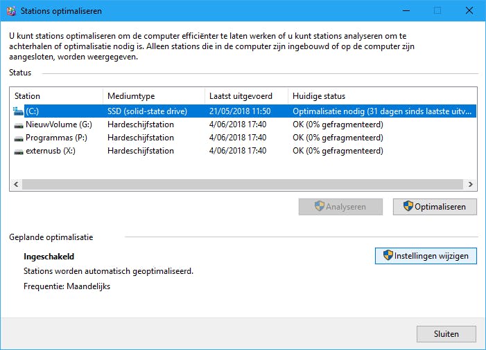 Je hoeft echter niet wakker te liggen van deze materie: Windows is namelijk wel zo slim om zelf voor een regelmatige defragmentatie te zorgen. Dat heb je snel genoeg gecheckt. Start de Verkenner, klik op Deze pc en klik een station met de rechtermuisknop aan. Kies Eigenschappen, ga naar het tabblad Extra en klik op Optimaliseren. Je kunt nu de instellingen van de aangesloten stations bekijken. Via Instellingen wijzigen / Gepland uitvoeren kun je een geschikte frequentie instellen (zoals Maandelijks). Je hoeft overigens niet bang te zijn dat Windows ook ssd’s gaat defragmenteren: op deze schijven beperkt het OS zich tot andere optimalisaties met behulp van het trim-commando.