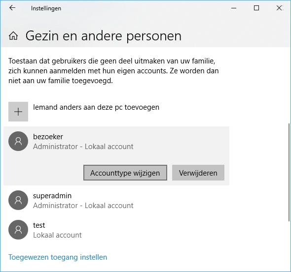 Weliswaar is het handig om je altijd aan te melden met het administratoraccount – op die manier hoef je niet telkens het account-id van een administrator in te vullen wanneer je een Windows-instelling wilt wijzigen of software wilt installeren – maar veilig is het niet bepaald. Immers, zoals we al aangaven in tip 06, liften malware en hackers mee op de rug van het account waarmee jij bij Windows bent aangemeld. Is dat een administratoraccount, dan krijgt dat gespuis meteen ook veel meer armslag. Je doet er daarom verstandig aan ook voor jezelf – en zeker voor eventuele medegebruikers – een standaardaccount te creëren en je voor dagdagelijks gebruik daarmee aan te melden. Je creëert zo’n account via Instellingen / Accounts / Gezin en andere personen / Iemand anders aan deze pc toevoegen. Klik vervolgens het account aan en kies Accounttype wijzigen, waar je dan Standaardgebruiker selecteert.