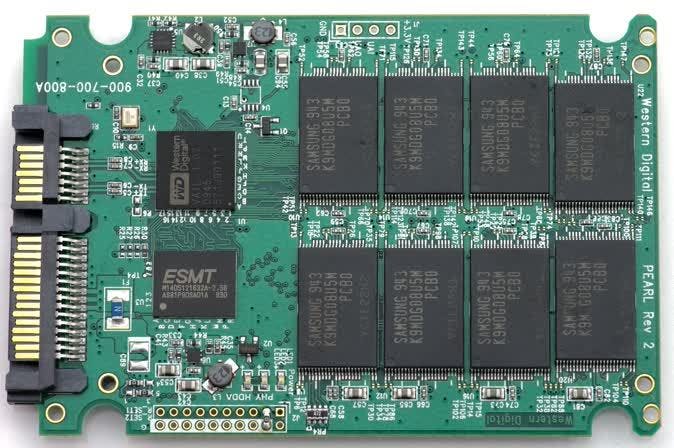 Links zie je de SATA-connector en aan de rechterkant vind je chips met flash-geheugen. In dit geval zijn dat er 32, je ziet er maar acht, maar er zijn vier chips opgestapeld. De chip met het WD-logo is de SSD-controller. De ESMT-chip fungeert als cache.