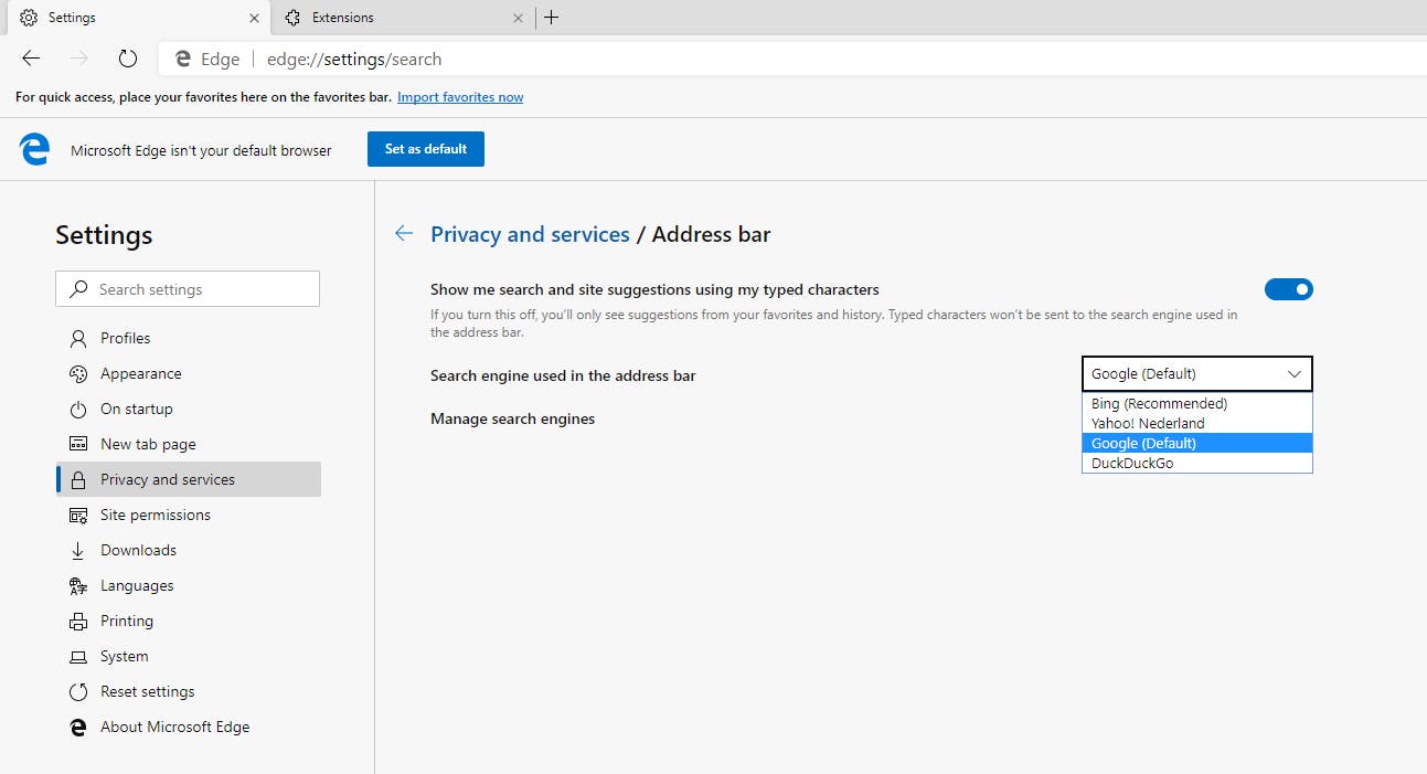 Het is je misschien al opgevallen dat Bing de standaard zoekmachine is. Dit pas je ook aan onder Privacy and Services, kopje Address bar. Bij Search engine used in the address bar kies je een alternatief, zoals Google of het privacy-vriendelijke DuckDuckGo. Onder Manage Search Engines en Add voeg je zelf sites toe, maar dat lijkt nog niet goed te werken.