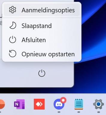 Open het Startmenu en klik op de knop Aan/uit (rechtsonder in het menu). Kies voor de nieuwe optie Aanmeldingsopties. Het instellingenmenu wordt geopend.