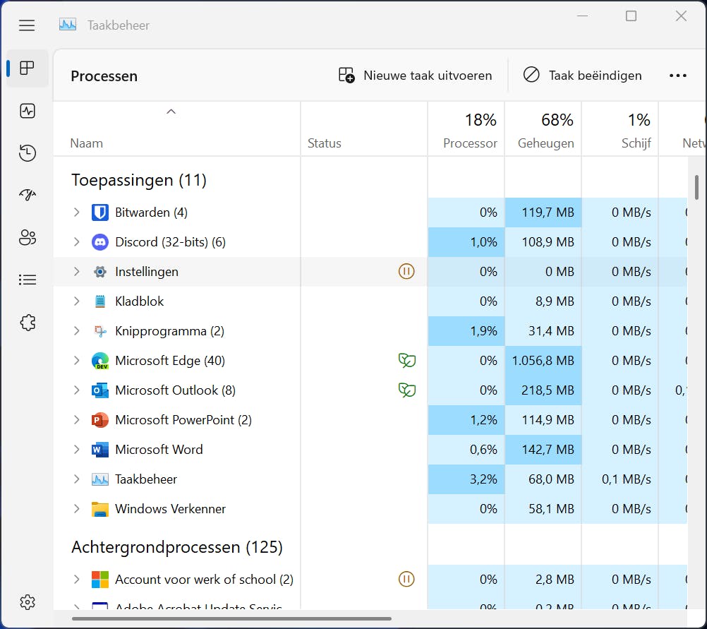 Taakbeheer is in de update eveneens onder handen genomen. Je opent het onderdeel snel via Ctrl+Shift+Esc. Aan de linkerzijde vind je de verschillende categorieën. Sommige apps zijn voorzien van een groen blaadje. Het gaat hier om de efficiëntiemodus, waarbij Windows het brongebruik van deze apps probeert te minimaliseren. Dat komt van pas voor apps die vaak voortdurend zijn geopend, zoals de browser en e-mailclient.