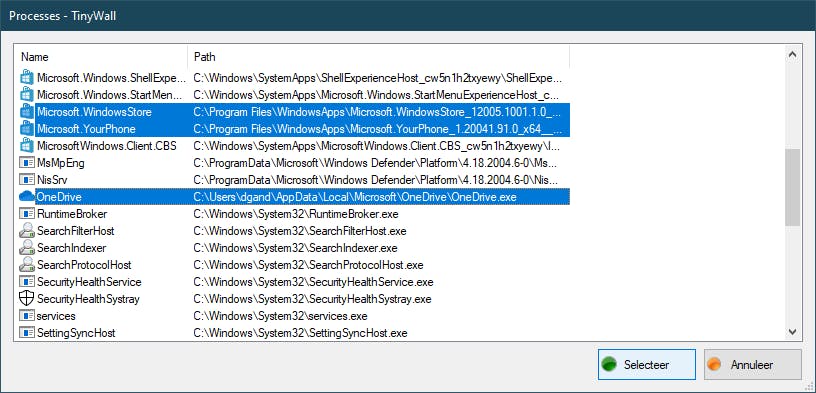 Met de tweede manier kun je ook een proces toegang geven tot de internetverbinding. Klik op het pictogram van TinyWall en kies Whitelist volgens proces. Een overzicht van alle processen verschijnt. Selecteer het proces dat je toegang wilt geven. Gebruik de Shift-toets om in één keer hele secties te selecteren of de Ctrl-toets om meerdere, losse processen te selecteren. Klaar? Bevestig met een klik op Selecteer.