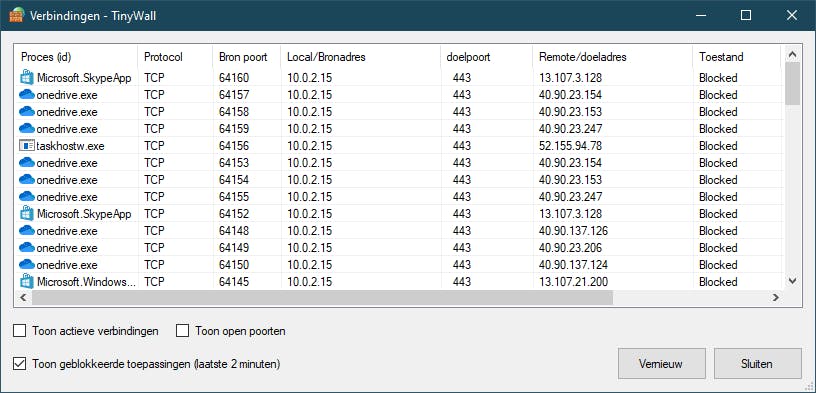 Een goede beveiliging begint met inzicht. Bekijk welke programma’s gebruikmaken van de internetverbinding. Open het menu van TinyWall en kies Toon verbindingen. In een lijst verschijnen de programma’s die gebruikmaken van de internetverbinding. Standaard worden de actieve verbindingen getoond. Klik op de kolom Proces om de programma’s op alfabetische volgorde te sorteren.