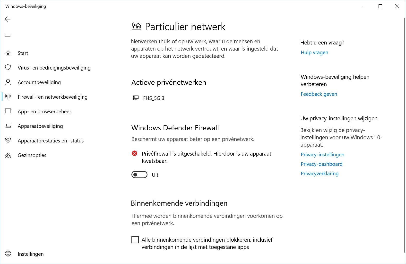 Het beste kun je de ingebouwde Defender Firewall uitschakelen. Dit is overigens niet verplicht: twee firewalls kunnen wel naast elkaar draaien. Controleer bij de beveiligingsgebieden Particulier netwerk, Openbaar netwerk (en Domeinnetwerk, als je gebruikmaakt van de Pro-editie van Windows 10) of de firewall is in- of uitgeschakeld.