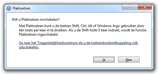 Je schakelt de functie uit door te bladeren naar Configuratiescherm / Toegankelijkheid / Toegankelijkheidscentrum / Het toetsenbord eenvoudiger in het gebruik maken. Daar verwijder je het vinkje bij Plaktoetsen inschakelen.
