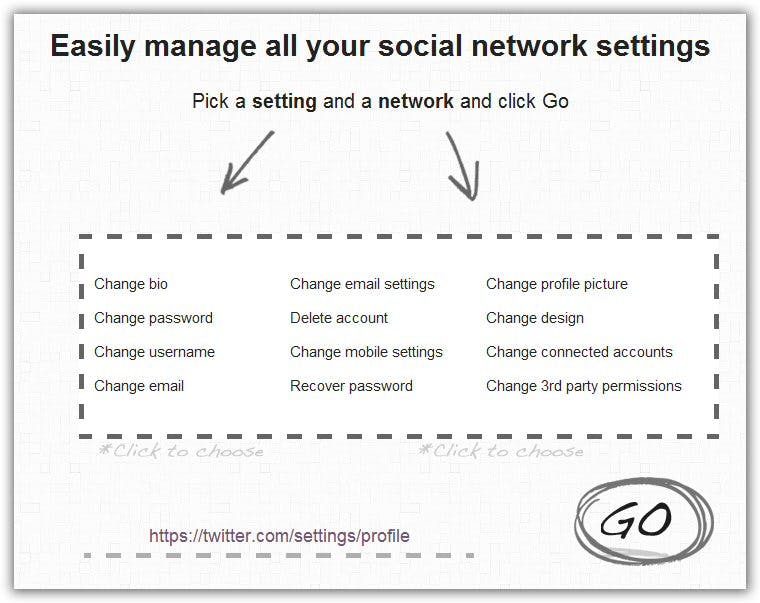 In een keuzemenu biedt de site twaalf opties voor in totaal dertien verschillende diensten, waaronder Twitter, Facebook, LinkedIn en Google+ (afbeelding 2). Wilt u een instelling op een netwerk snel aanpassen? Klik dan op één van de opties en selecteer vervolgens een netwerk. Om een profielfoto op Twitter te wijzigen, klikt u op ‘change profile picture’ en selecteert u als netwerk Twitter (afbeelding 3). Een klik op ‘Go’ is daarna nodig om de pagina op Twitter te vinden waarop u uw foto kunt vervangen. Op dezelfde manier zijn pagina’s te vinden waarop u een mailadres kunt aanpassen, het uiterlijk van Facebook of YouTube kunt wijzigen of een wachtwoord op Pinterest kunt resetten.