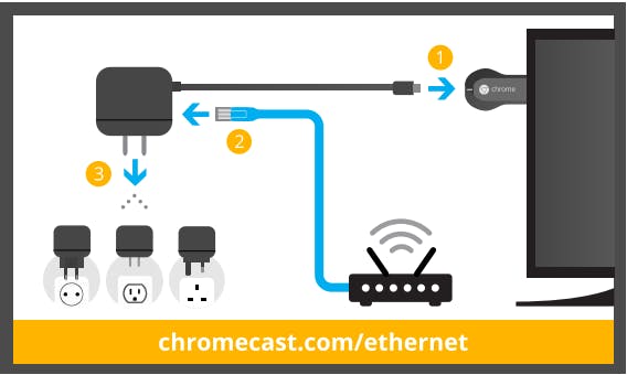 De adapter werkt als volgt: steek 'm in het stopcontact en koppel 'm met een ethernetkabel aan de router. Vervolgens stop je de micro-usb-kabel in de Chromecast. Nu kun je streamen over je vaste verbinding.