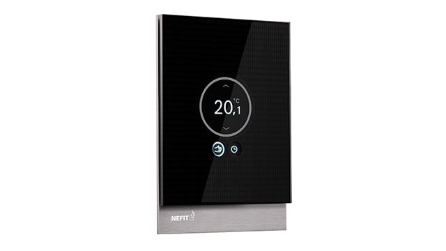 De Nefit ModuLine Easy oogt wat luxer dan de meeste andere slimme thermostaten, al valt de adviesprijs van 199 euro nog alleszins mee. De rechthoekige glasplaat is vrij fors, dus het is belangrijk dat er op de beoogde plek voldoende ruimte is. Aansluiten gebeurt via de bestaande tweedraadsverbinding. In de donkere glasplaat zit een rond aanraakpaneel verwerkt, waarmee je de temperatuur instelt en het klokprogramma in- of uitschakelt.